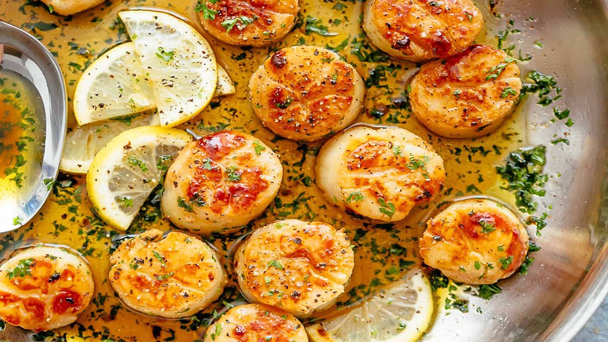 Còi sò điệp áp chảo vừa chín tới, bên ngoài vàng nhẹ, bên trong mềm ngọt, dùng kèm sốt bơ chanh thanh tao